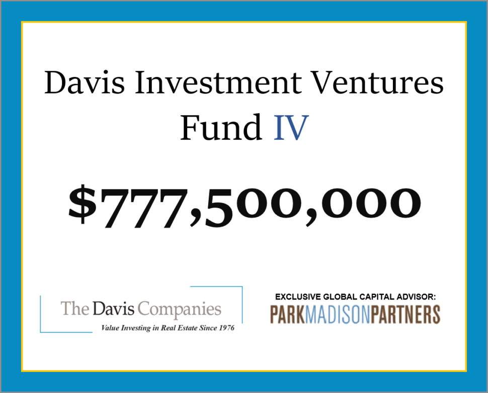 BOSTON, September 30, 2020 – The Davis Companies announced today the closing of its latest value-add real estate fund, Davis Investment Ventures Fund IV, LP (DIV IV), with total equity commitments of US $777.5 million, significantly exceeding its original fundraising target of $650 million. Commitments were made by a diverse group of limited partners, including public pension plans, insurance companies, endowments, foundations, family offices and high net worth investors. Park Madison Partners acted as the exclusive institutional Placement Agent on behalf of DIV IV.